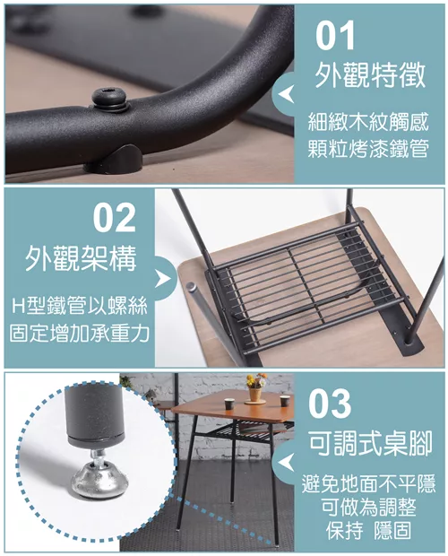 木紋觸感桌板加上鐵管以霧面顆粒烤漆製成
