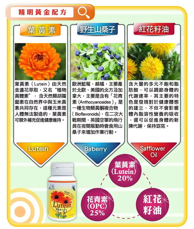 大自然金盞花萃取之葉黃素及山桑子(越橘)特有之『花青素』(Anthocyanosides)經生化科技提煉而成,一天只要一顆,清晰明亮就靠它!
