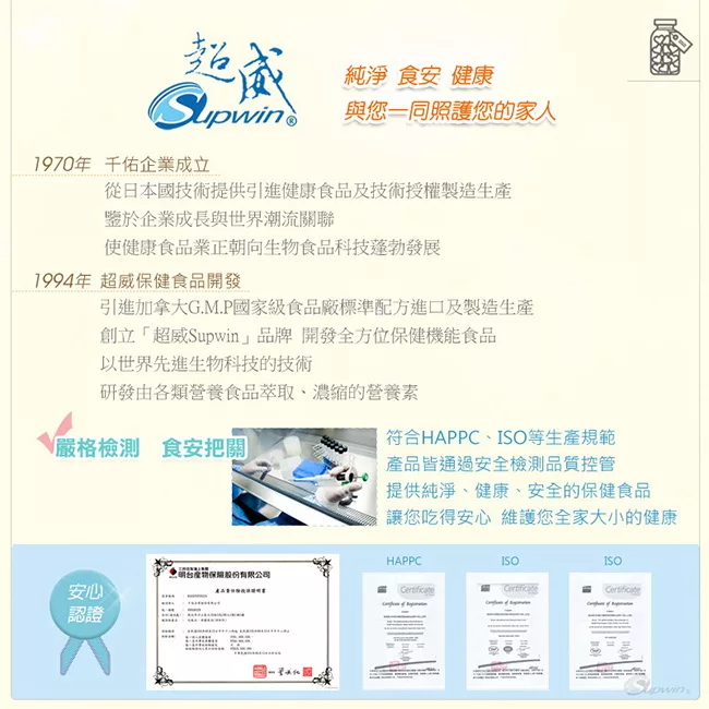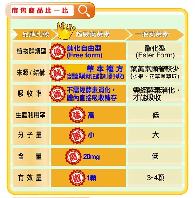 其?『超威葉黃素』由金盞花萃取之含量高達20%,由100毫克的金盞花萃取物,其所含的純葉黃素(100毫克x20%)=20毫克,一天只要一顆即可達到保養功效, 所以在看產品成份標示時,要更仔細的確認其金盞花萃取物放了多少毫克,其所含的純葉黃素是幾%的,這是最重要的, 否則可能會因小失大買到了極少含量卻又很貴的葉黃素產品!